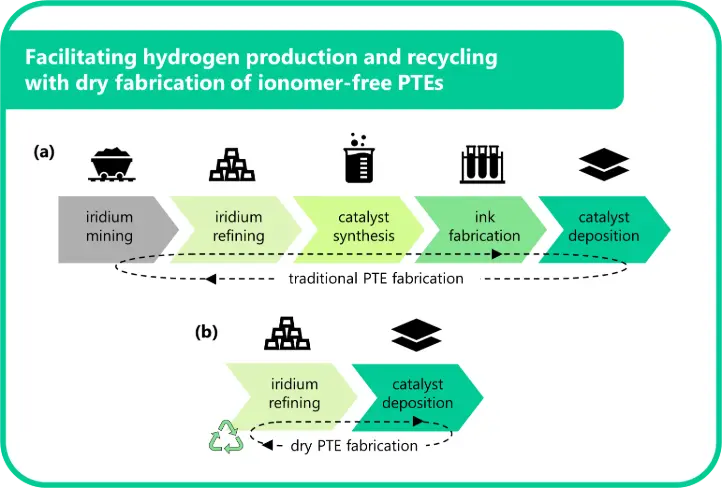 The presence of ionomers in the catalyst layers forms a major obstacle in recycling iridium from conventional electrodes. The most widely used ionomer, Nafion, is a fluorinated polymer that belongs to the class of PFAS (per- and polyfluoroalkyl substances), known for their chemical stability and environmental persistence. Nafion not only complicates the selective recovery of iridium but can also produce extremely hazardous gases when processed, especially during high-temperature or oxidative recycling steps [7]. In contrast, ionomer-free PTEs offer a cleaner and more accessible platform for recycling, paving the way for safer and more efficient recycling solutions.